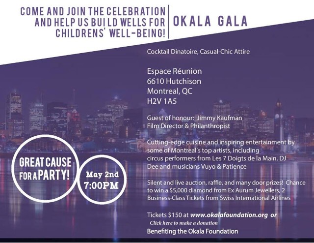 For the first time, Montreal will be hosting the Okala Gala on May 2, 2015. The Okala Foundation was created by President and Founder Tamara Davy, and is a Canadian-based charity with the purpose of improving the quality of life for children in the villages of Cameroon.