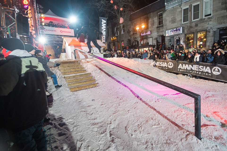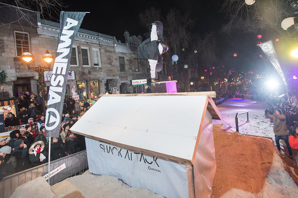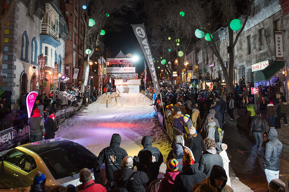 Every year in December, Amnesia hosts their annual ShackAttack, a snowboarding and free ski competition. In the Plateau area of Montreal, on St-Denis between Sherbrooke and Ontario, the whole street is shut down in order for the event to take place. The spectacle is free to watch and those who think they have what it takes compete for a chance to win over $3000 in prizes. Last competition was held on December 6-7 2013, with both men and women participants. Those who wished to sign-up had a time slot for inscriptions and payed a fee of $50 for men and $25 for women. The event allows for semi-professional athletes to do what they love, in the city they’re from, in front of a crowd of locals and passerby’s peering from the sidewalks. The annual event is something completely out of the ordinary, with full installations covering one of Montreal’s most frequented streets. An outlandish scene in a busy city street, Shackattack is a reminder that you can find something entertaining in Montreal no matter where you are and in the most random of places. Let’s face it, what’s cooler than a ski and snowboard obstacle course competition, in the middle of the city, on Xmas-ornamented, downhill Saint Denis Street. Check out the pictures below, you got to see it to believe it.
