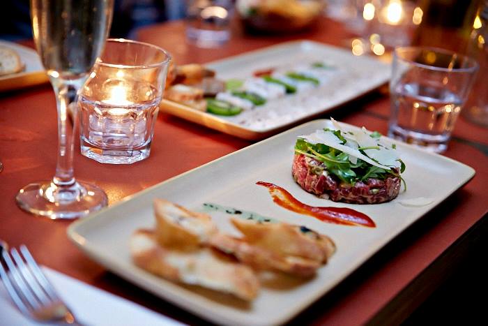 For a 5 à 7 with co-workers, a get-together with friends, or even a fun date-night, Mme Lee stands out with its ambiance. Their decor is anything but ordinary: walk into a bar with an industrial feel, complete with angular structures and tiled walls. The look is reminiscent of a chic subway station mixed with futuristic elements, such as fibre optic-looking lighting. The look at Mme Lee also respects the architectural aesthetic of the Quartier des Spectacles by incorporating wooden tables, which are inspired by the wooden panels of the Maison Symphonique in Place des Arts.