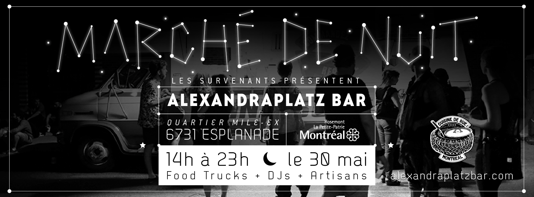On May 30th between the hours of 2:00pm and 11:00pm, street culture will be celebrated at 6731 Avenue de l’Esplanade. Enjoy the music of handpicked DJs while you tour the merchant booths with food in your hands at Marché de Nuit. A perfect street fair… well, except the lack of alcohol. On that note, it should be mentioned that the festival is being held right outside Bar Alexandraplatz. The little industrial bar in a white brick space is rendered dark by its distinct lack of lighting. But who would go inside with its massive terrace and distinct craft beers?