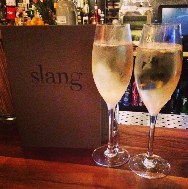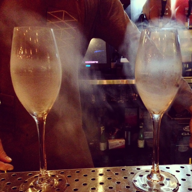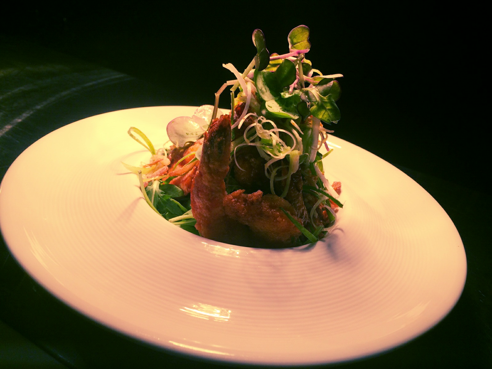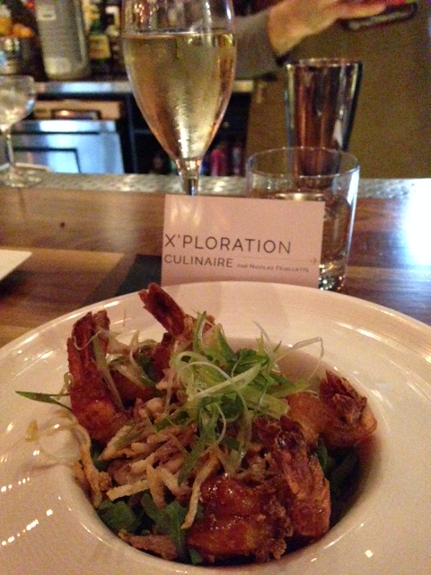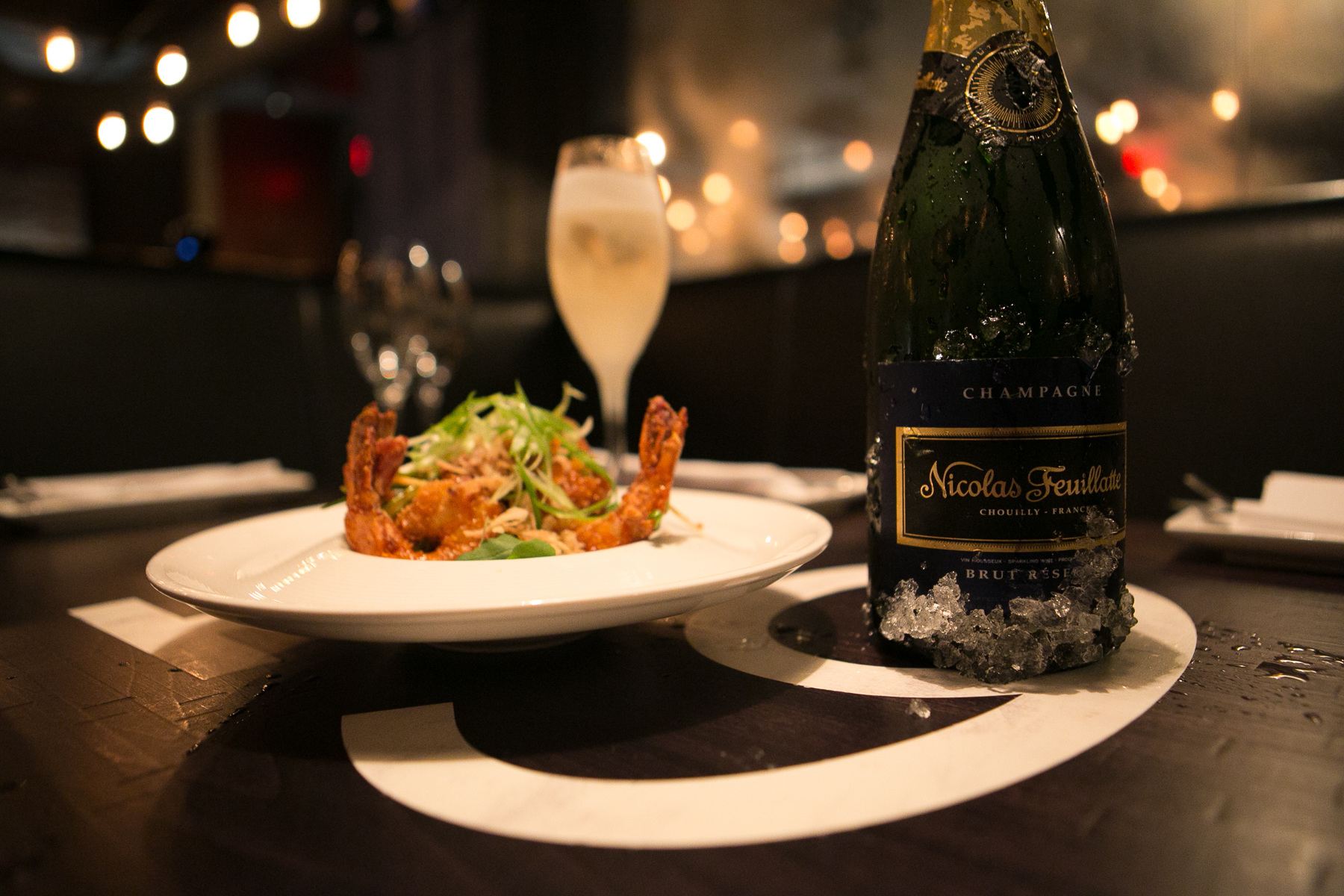 Now back to the meal. Let’s start with the champagne. The bartender put on a bit of a champagne show. He poured a bit in, then added liquid nitrogen to REALLY cool down our glasses. Is there anything better than freezing cold, light and crisp champagne? No, we didn’t think so either. Le Slang paired the flute of Champagne Nicolas Feuillatte Brut with their signature Firecracker Shrimp – so named for their zingy red pepper sauce – a real ying/yang effect with the freezing cold bubbly. It’s always nice when someone has already thought out what you’ll eat and what you’ll drink with it.