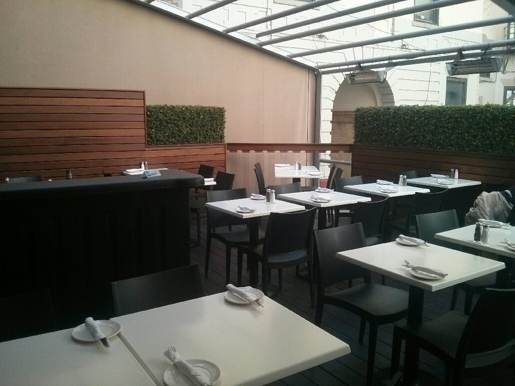 Walk into a shnazzy décor, complete with high ceilings, leather banquettes, and a lunch-counter inspired bar that spans the lower level of the restaurant. The second level includes the much coveted terrace overlooking a courtyard with an adjustable awning so you can enjoy the outdoors rain or shine.