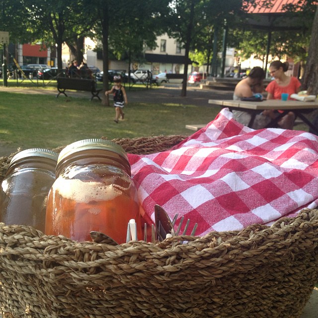 The restaurant’s summer special includes a picnic in the park. When the weather is nice, the restaurant provides patrons with the tools to picnic in the park across the street. They prepare a picnic basket with your order that includes: a red and white checkered table cloth, dishes, cutlery, napkins, a variety of their famous sauces, and mason jars of water and your selected drinks (only non-alcoholic beverages are permitted in the park).