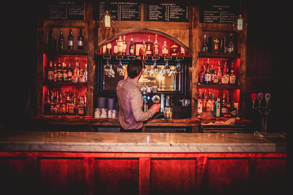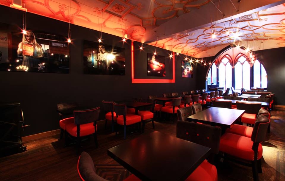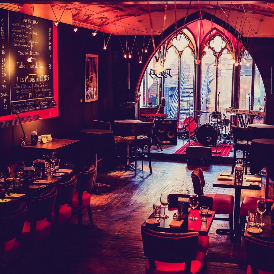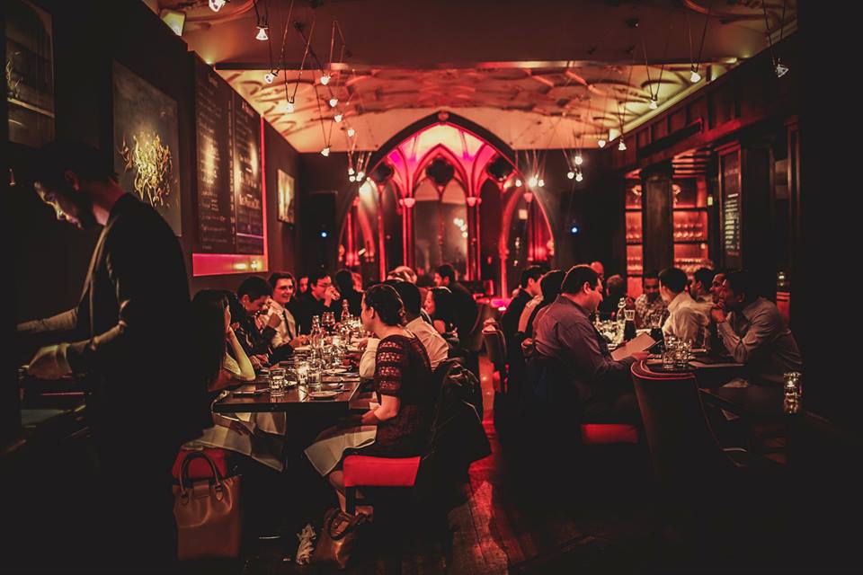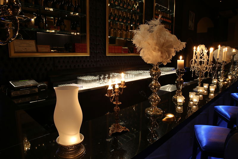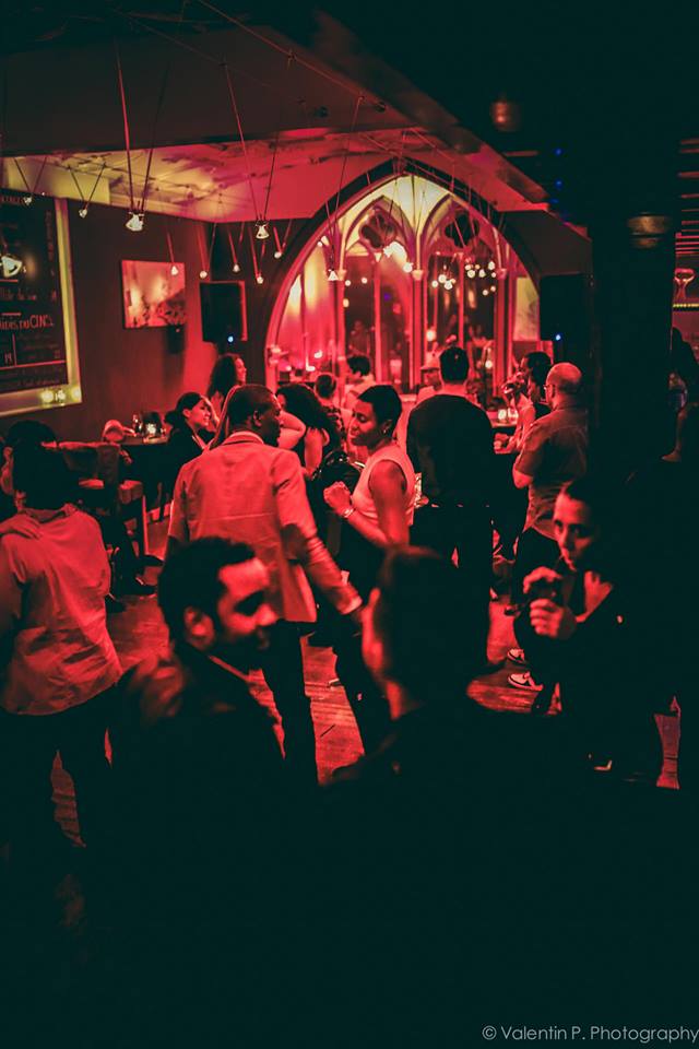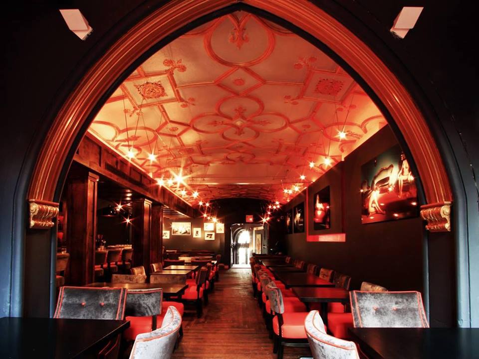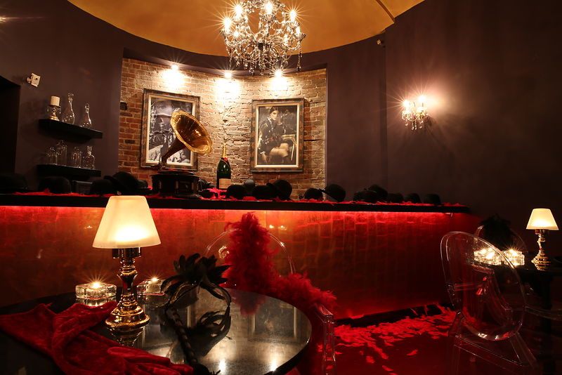 Indoors, the ambiance is set with red lighting. The décor is a red and black motif with velvet couches that ooze comfort. The ceiling is reminiscent of French royalty apartments, with beautiful gold and blue details. You’ll feel like you’re in an ancient manor, which is in fact what the building itself was meant to be.
