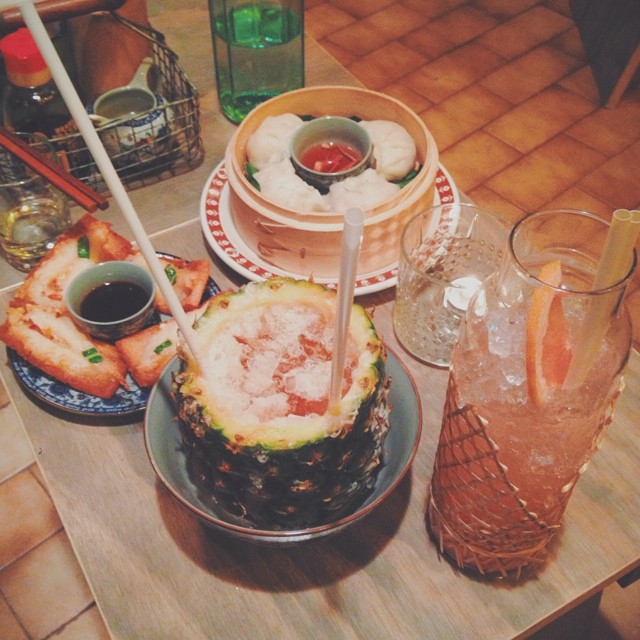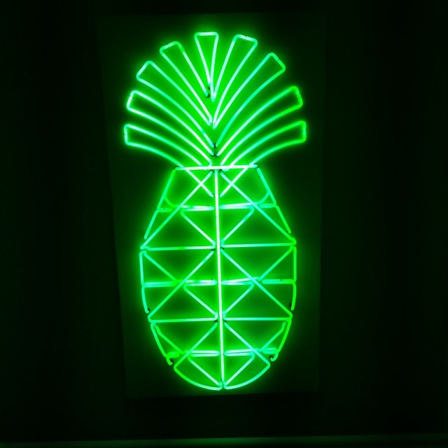 A newcomer on the Montréal cocktail bar scene, Le Mal Nécessaire is a tiki cocktail bar with a twist. What is a tiki drink, you ask? Tiki drinks usually contain rum and fruit juices and are extravagantly garnished with fruit and cocktail umbrellas. Le Mal Nécessaire, located in Chinatown, was recently opened in mid-May. Although hidden in a basement location, you can see its bright neon-green pineapple symbol as you walk down the street.