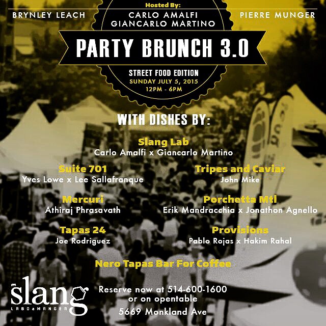 On Sunday, July 5th, from 12:00pm to 6:00pm, Le Slang is throwing their Party Brunch 3.0, Street Food Edition. Some of the same faces from the last party brunch will be in attendance along with some new (and very welcome) additions, like Erik Mandracchia and Jonathan Agnello from Porchetta Mtl, John Mike from Tripes and Caviar, and Pablo Rohas and Hakim Rajal from Provisions.