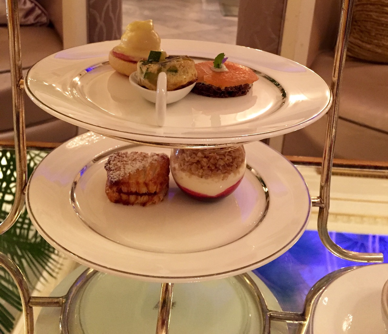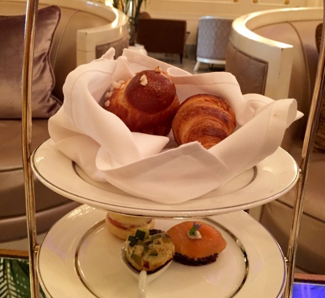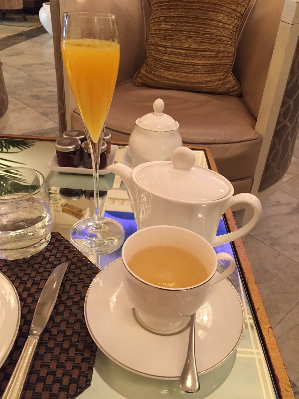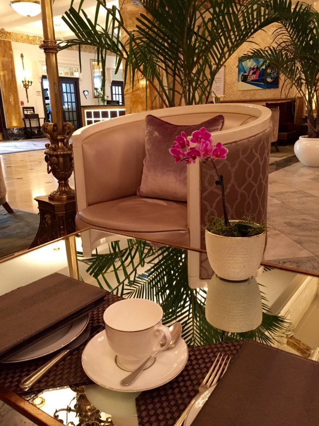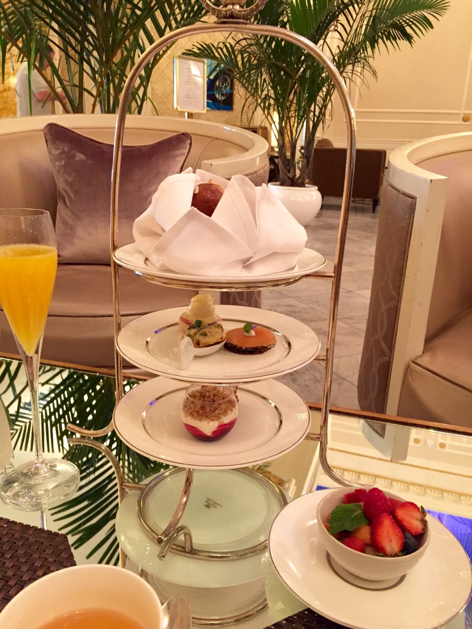 Breakfast tea is served daily from 9:00am to 11:30am in the opulent Palm Court. The sculptured moldings on the soft cream walls, the shiny brass accents, and the picturesque tropical dome ceiling evoke British pomp. There’s an overall grand feeling the moment our heels step onto the marble grounds. We were seated beside a covetable and fully-stocked bar serving mimosas among other delicious libations, and sat in cozy baroque chairs decorated with gold embellished pillows.