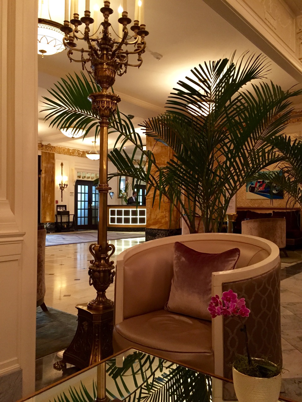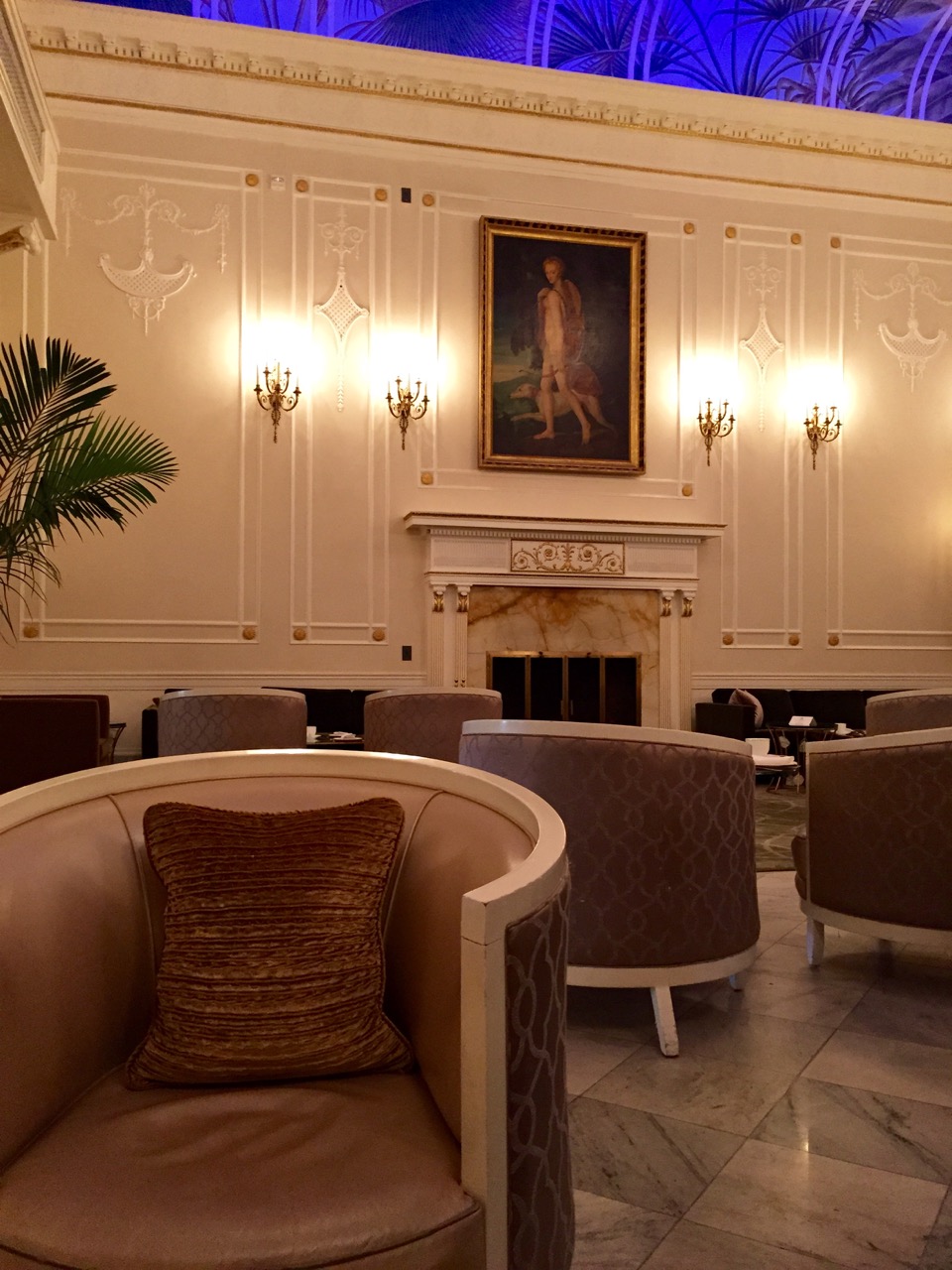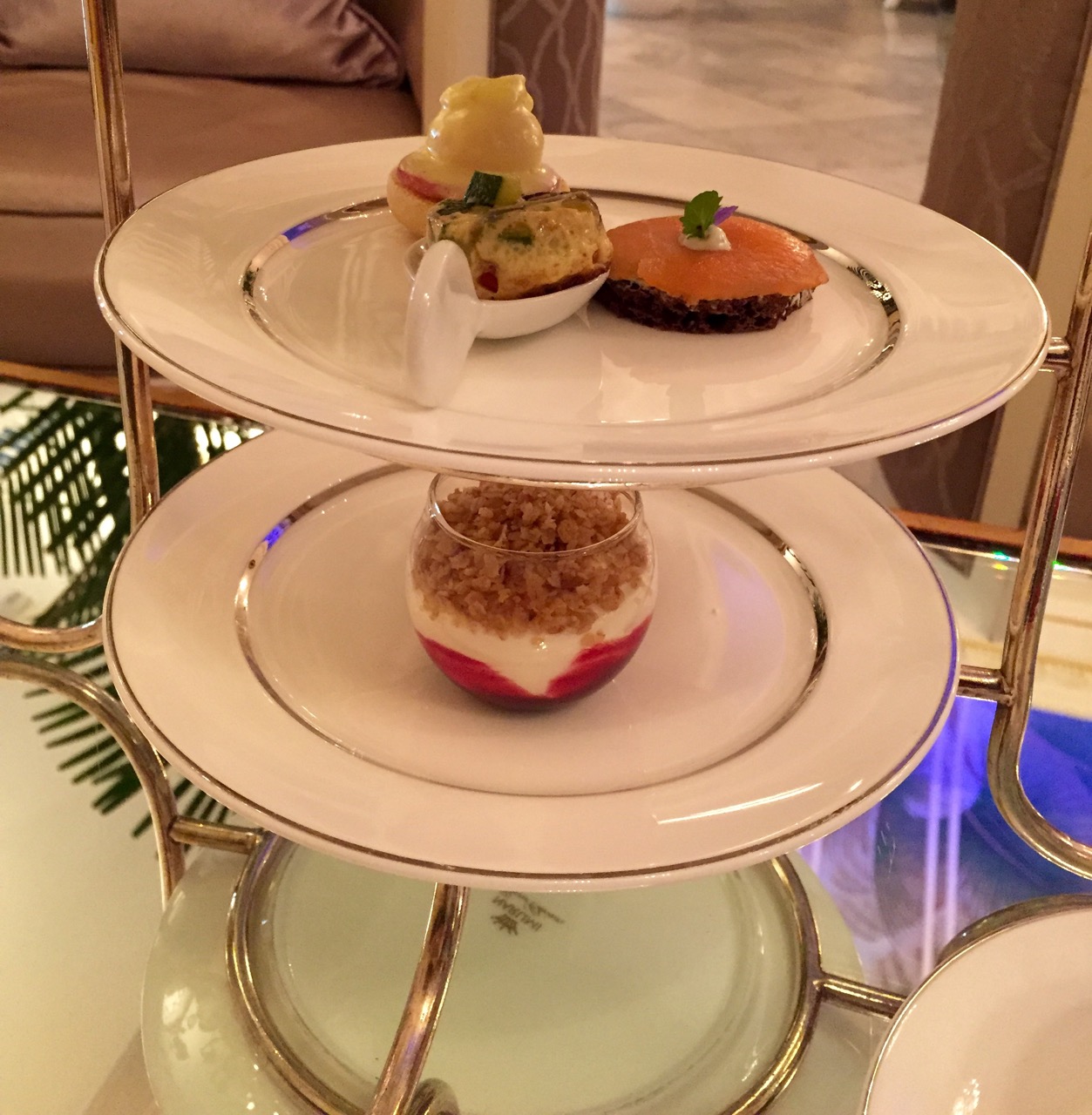 Breakfast tea is served daily from 9:00am to 11:30am in the opulent Palm Court. The sculptured moldings on the soft cream walls, the shiny brass accents, and the picturesque tropical dome ceiling evoke British pomp. There’s an overall grand feeling the moment our heels step onto the marble grounds. We were seated beside a covetable and fully-stocked bar serving mimosas among other delicious libations, and sat in cozy baroque chairs decorated with gold embellished pillows.