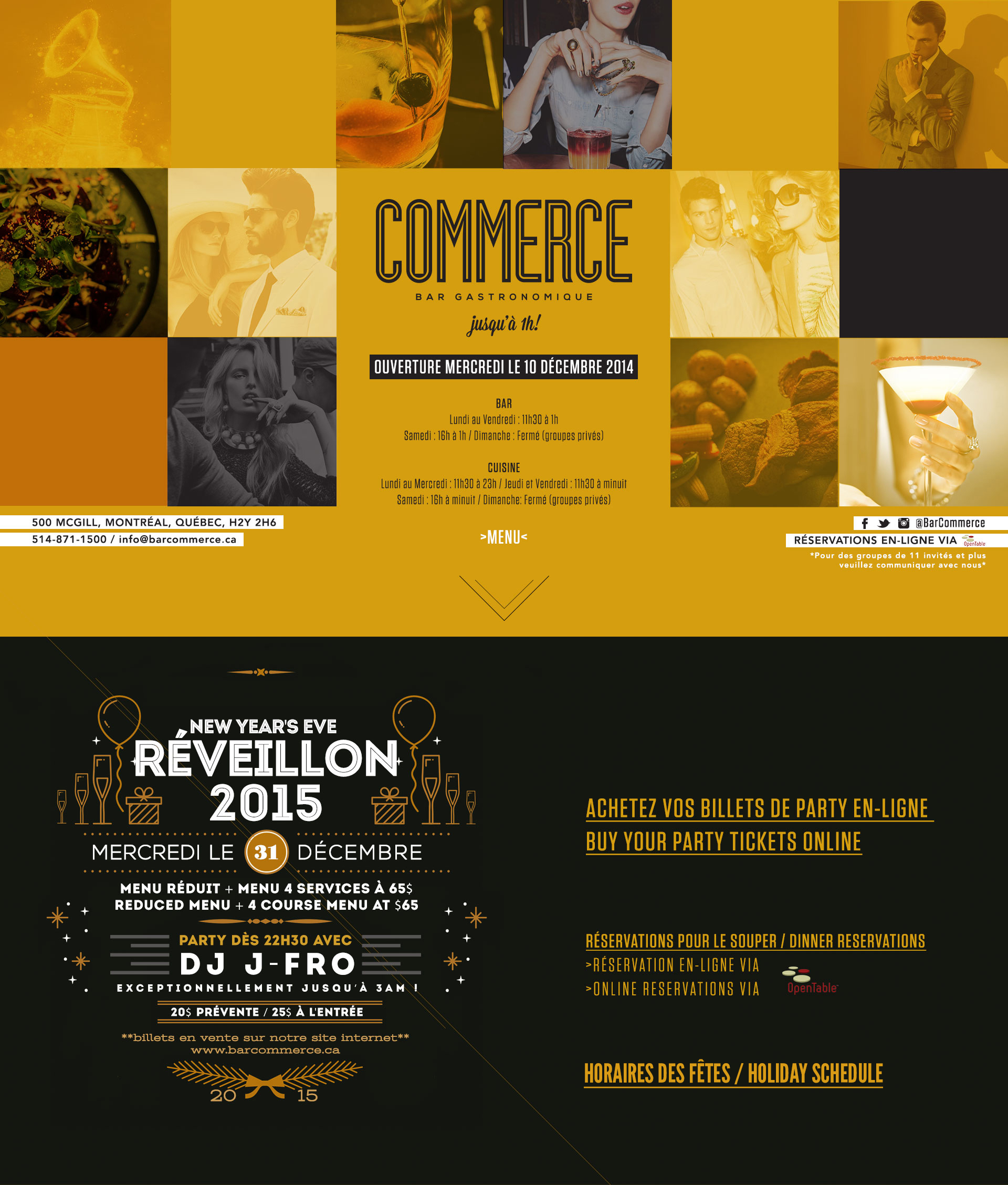 New on the scene, Commerce Gastrobar just opened in December and they are already planning a New Year’s Eve bash with gourmet bar eats. Your options include a reduced menu and 4 course menu at 65$, or party at 11:30pm until 3:00am with DJ J-Fro for $25 at the door. If you’re dining at any other Mtl Cuisine restaurant prior to partying it up, entrance at Commerce is free. Check out their website to reserve.
