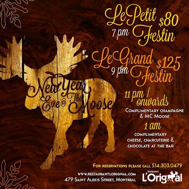 L’Orignal is offering a few options: at 7:00pm, they have “Le Petit Festin” for $80 and at 9:00pm, “Le Grand Festin” for $125. If you’re there after 11:00pm, there is complimentary champagne and MC Moose and after 1:00am, start 2015 with complimentary cheese, charcuterie, and chocolate at the bar.