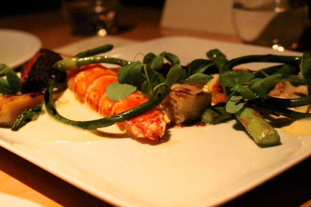 The grilled beef back steak with a lobster tail has vanilla and madeira hollandaise sauce with asparagus and potato gratin. The perfect surf ‘n turf!