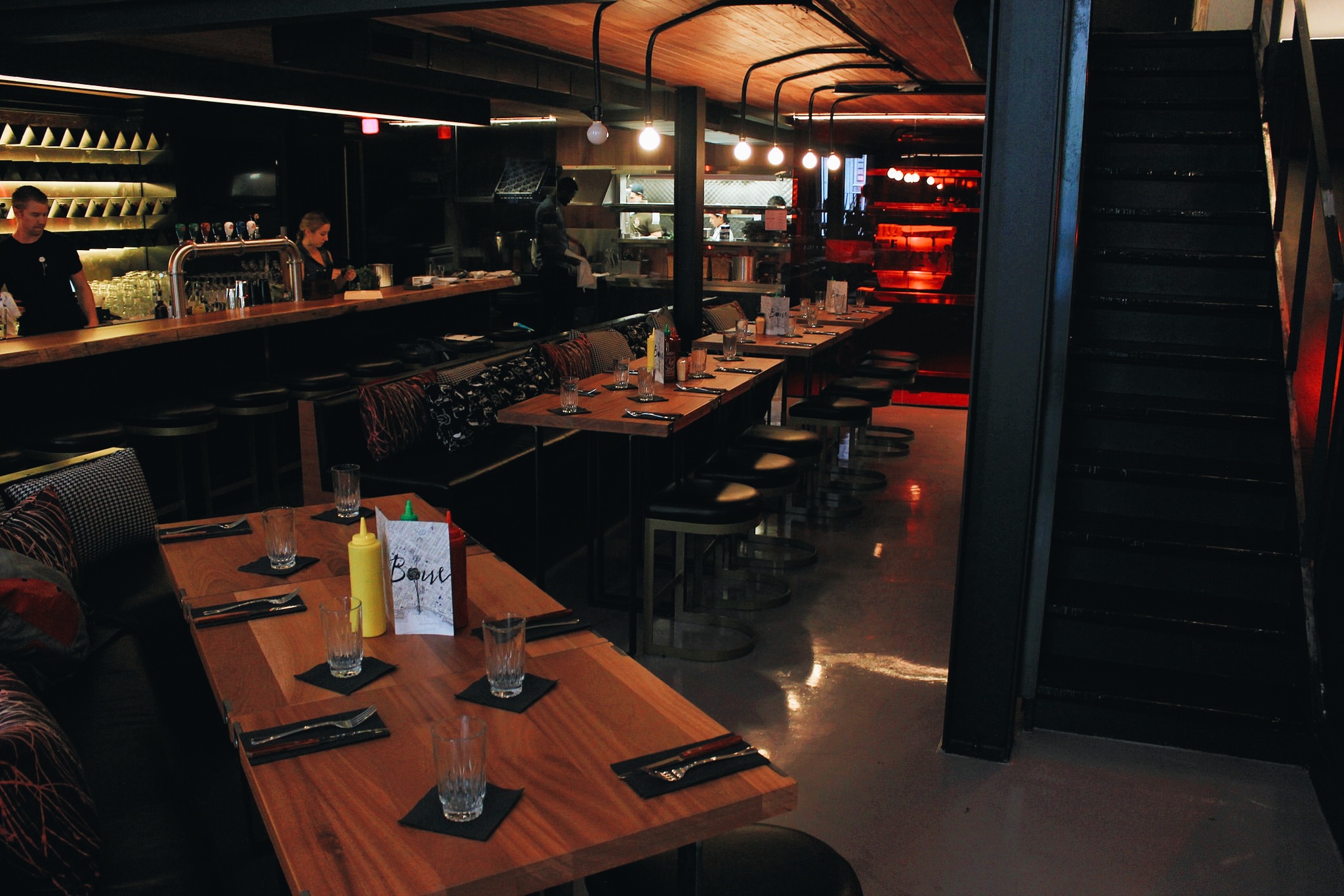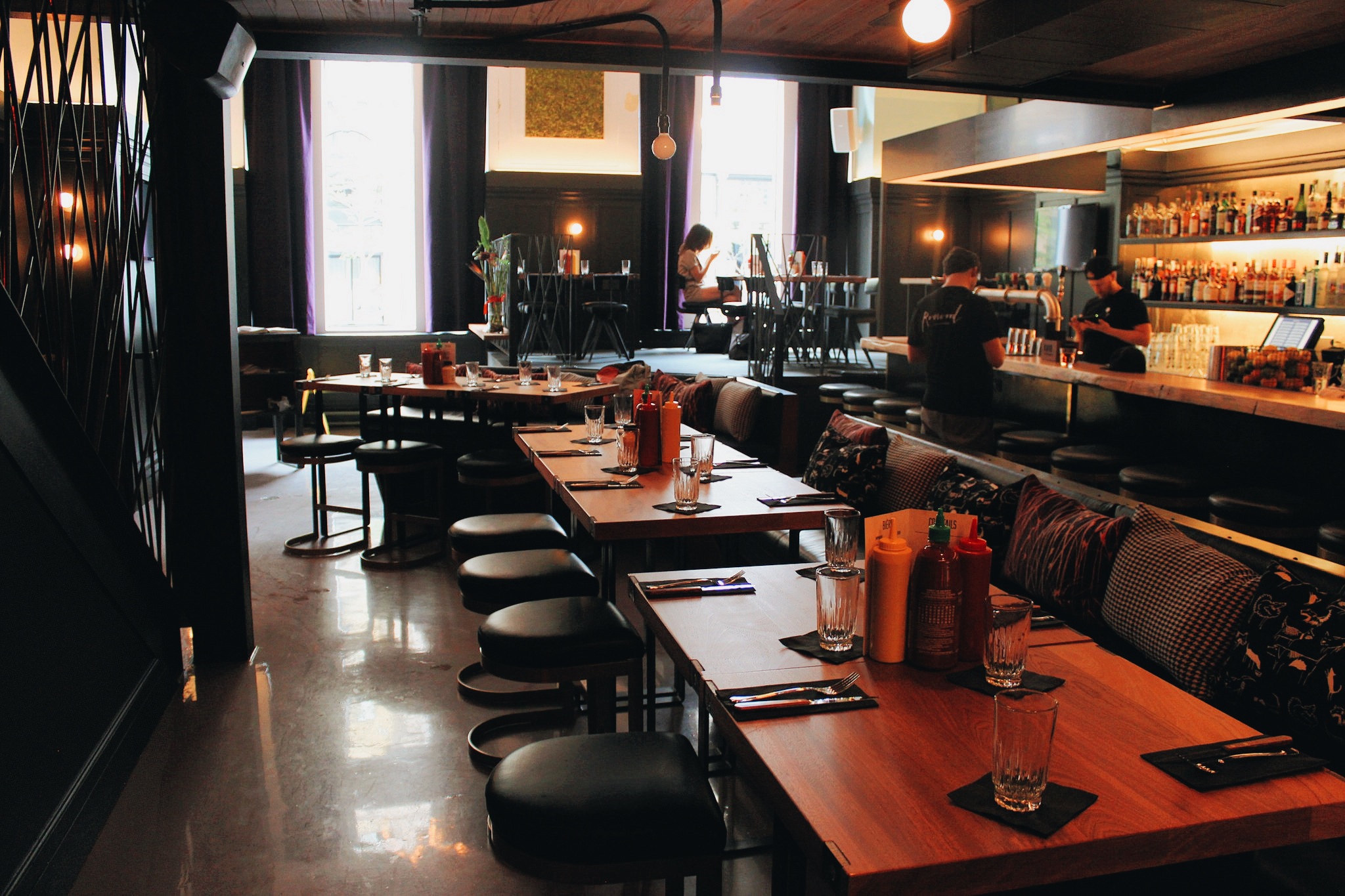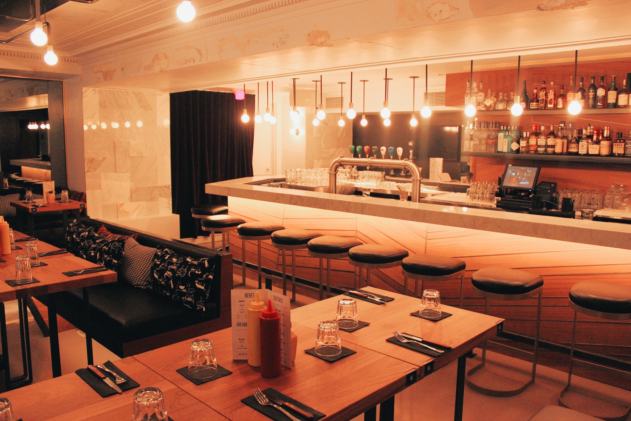 Jonas: A classy, grungy, rock n’ roll feel. Benoît Séguin a.k.a DJ Bender did a great job. Everything in here is made out of real wood; the tables, the sign outside… Even the bar is one big piece of wood. We wanted to give the place that warm, cozy feeling.