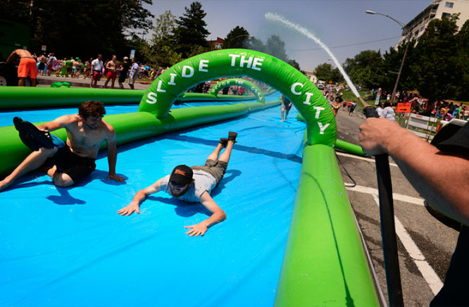 If you’ve heard about Slide the City and wondered when Montreal will be getting it, wonder no more, because it’s coming this summer! From the creators of Colour Me Rad, on August 15th, Slide the City brings out a huge 1000ft slippery water slide to a local city street on a nice hot summer day.
