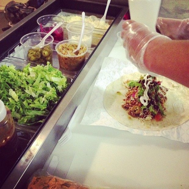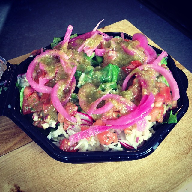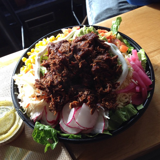 Right. About that menu. It’s all pretty straight forward: you can have a burrito, burrito XL, tostada, salad bowl, or salad bowl XL. Then you have to choose your meat (which is being smoked at Blackstrap): chicken tinga, chorizo pork, or ancho and cumin brisket. Or of course, you can do it veggie, which is black beans or hominy (coarsely ground corn aka grits). The prices vary depending on what “vessel” you get (aka burrito vs. salad bowl) and what filler you get (meat vs. veggies). They range anywhere from $7 to $13.
