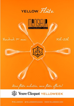 In case you missed last year’s edition, Veuve Clicquot’s Yelloweek is officially back in the city starting Friday May 1st, 2015 until May 7th, 2015. Another week full of gastronomic extravagance, shopping, and of course champagne. Kicking off this year’s events will be at Restobar Monsieur on Bleury, and Auberge Saint-Gabriel in Old Montreal. Like with all Yelloweek events, when you purchase a glass of Veuve Clicquot champagne at any of the participating restaurants, the second glass is on the house!